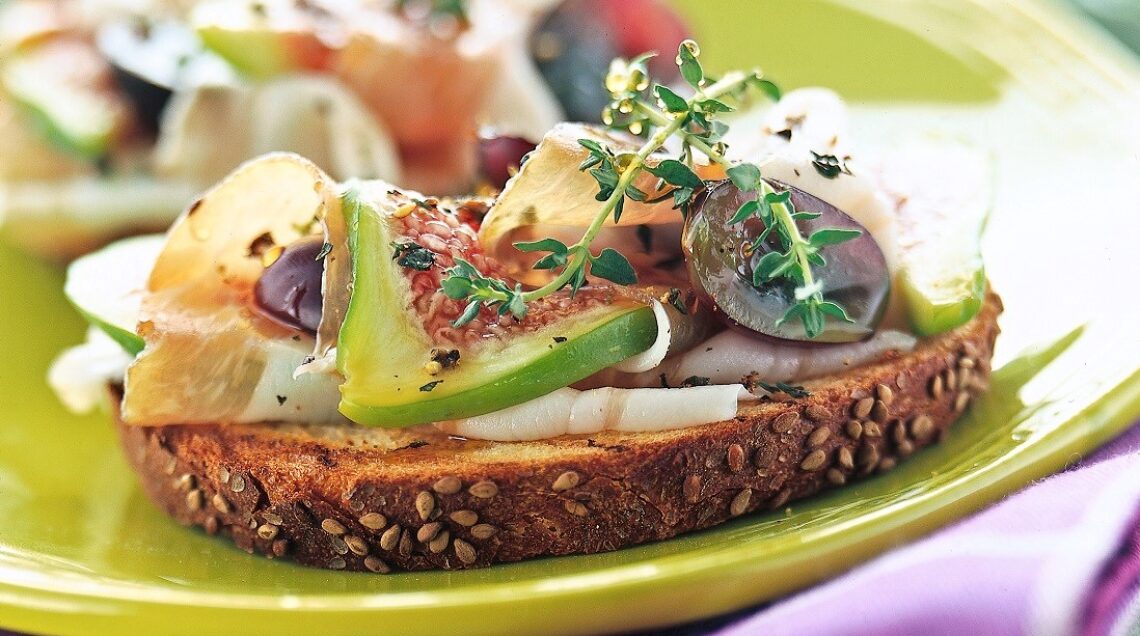 Bruschetta con stracciatella, mango marinato al basilico e prosciutto crudo