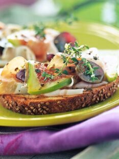 Bruschetta con baccalà mantecato, olive taggiasche e pomodori secchi