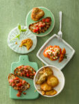 1) Per le bruschette con zucca, pancetta affumicata e capra, scalda l'olio con lo spicchio di aglio e un rametto di rosmarino tritato. Lascia insaporire il tutto per 3 minuti, quindi aggiungi la zucca a fettine, sala, pepa e cuoci per 5 minuti a fiamma bassa. Bagna con mezzo mestolo d'acqua, copri e stufa per 10 minuti circa, poi leva dal fuoco.