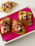 2) Tosta il pane per le bruschette in forno per 5 minuti Distribuiscivi sopra la zucca con il suo sugo, quindi aggiungi la pancetta, qualche ago di rosmarino e una fettina di formaggio per ogni fetta. Pepa e fai scaldare per 3 minuti sotto il grill prima di servire.