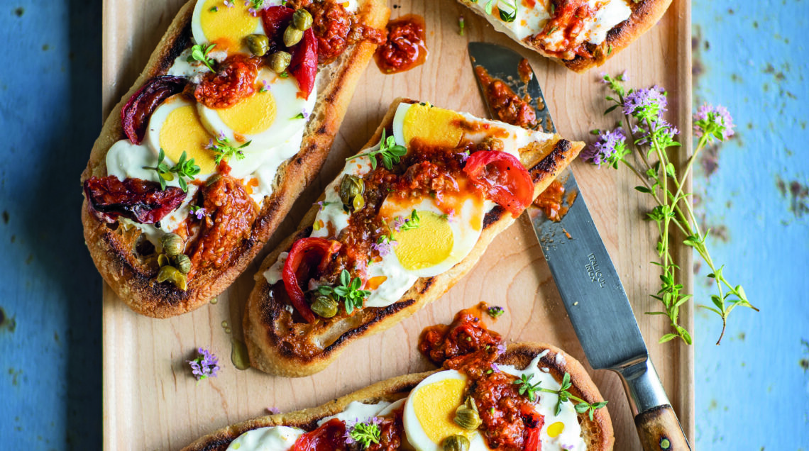 Fette di pane condite con pomodori, stracciatella, uova e capperi: buruschette strepitose per un pranzo all'aperto
