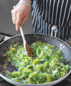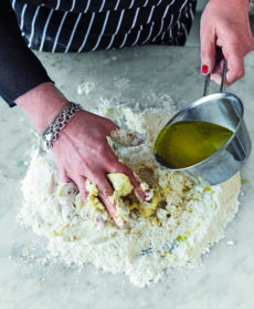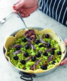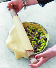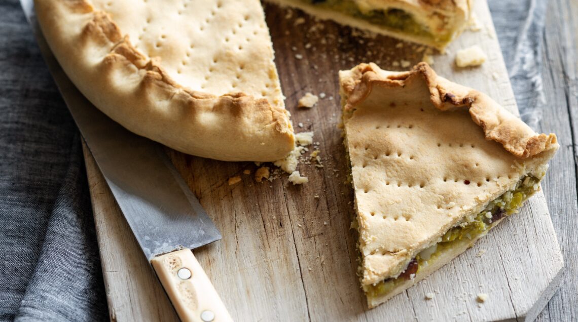 Porri, o cipollotti, sono la nota dolce del ripieno, reso sapido da olive, acciughe e, a sorpresa, una manciata di uvetta. Tutto racchiuso in un guscio croccante