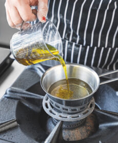 Preparate la pasta. Intiepidite 75 ml di olio e il vino in un padellino (la renderà più elastica), emulsionate con una forchetta e salate.