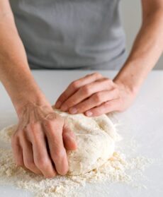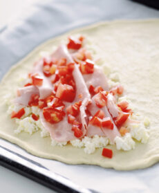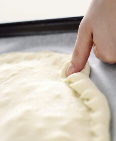 Piegate il disco di pasta sul ripieno, in modo da ottenere una mezzeluna, e sigillate i bordi, pizzicandoli con le dita. Preparate allo stesso modo un secondo calzone.