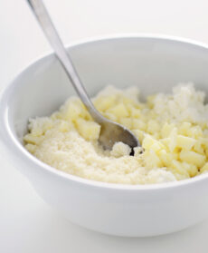 Per il ripieno, lavate i pomodori, tagliateli a metà, eliminate i semi, riduceteli a dadini, salateli e lasciateli sgocciolare in un colino. In una ciotola lavorate la ricotta con una forchetta per renderla cremosa. Aggiungete la provola (potete sostituirla con scamorza bianca) tagliata a dadini, il parmigiano grattugiato, una macinata di pepe e mescolate.