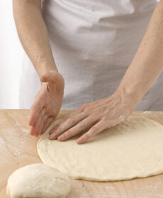Dividi in due parti 500 g di pasta da pizza e stendi una parte in un disco prima con il matterello, poi con la punta delle dita, fino allo spessore di circa 1/2 cm. Sistemalo in una teglia foderata con carta da forno, facendolo un po’ sbordare.