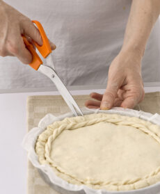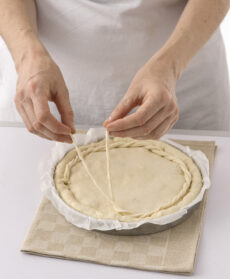 Stendi la restante pasta, meno un pezzetto, in un disco del diametro della teglia, sistemalo sul ripieno e ripiega verso l’interno i bordi della pasta sottostante, formando un cordoncino. Prepara con la pasta tenuta da parte due lunghe striscioline, sistemale, avvitandole, all’interno del bordo del calzone.