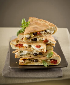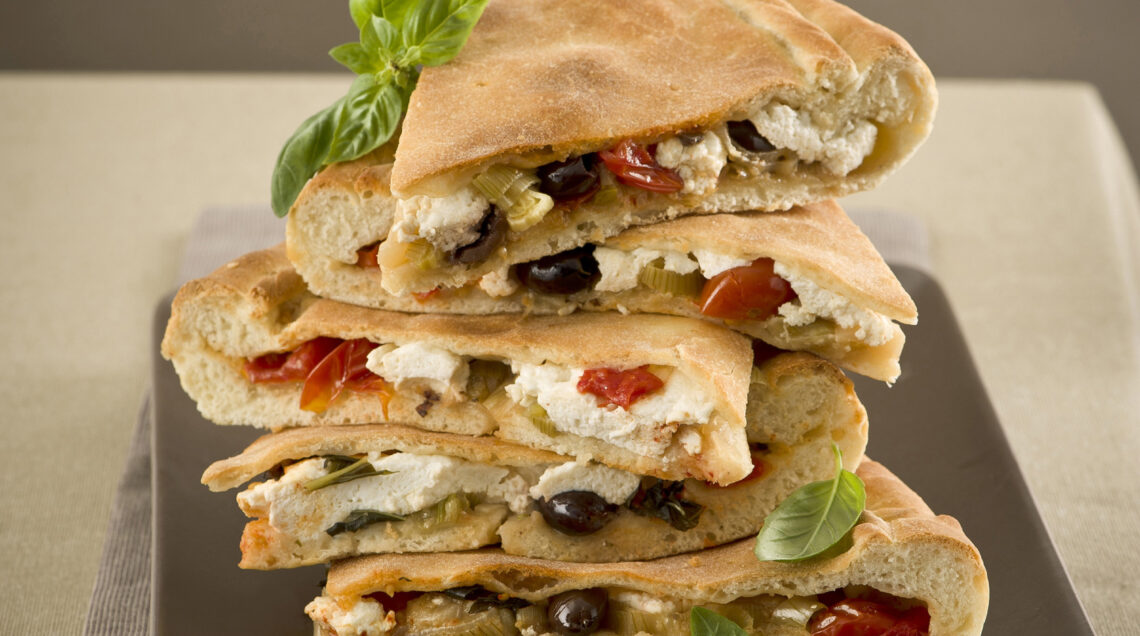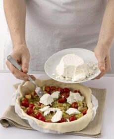 Fai soffriggere con un filo di olio 500 g di cipollotti a fettine; aggiungi 8 pomodorini tagliati a metà, 100 g di olive nere snocciolate, 3 filetti di acciuga e 3-4 foglie di basilico; cuoci per 5 minuti, regola di sale e pepate. Riempi con il composto la pasta nella teglia e distribuiscici sopra 300 g di ricotta di pecora.