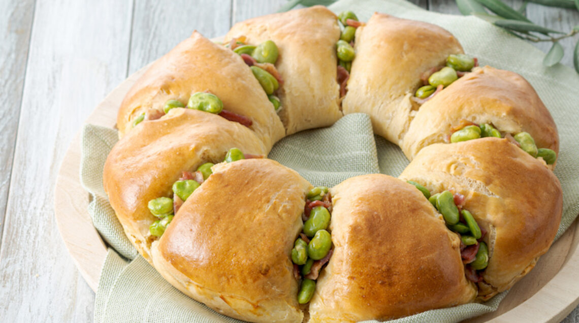 Questa ciambella è un'esplosione di bontà, con una farcia ricca e sfiziosa: grazie ai tagli praticati nella ciambella, il goloso ripieno di fave, pancetta e cipollotti fuoriesce un poco durante la cottura
