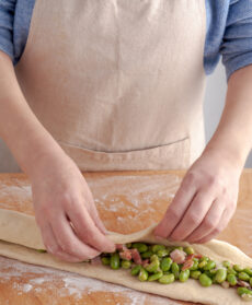 Preparate il ripieno. Tagliate la pancetta a pezzettini, rosolatelo con i cipollotti affettati e poi unite le fave. Stendete l'impasto formando un rettangolo di circa 70x20 cm. Disponete il ripieno al centro, su tutta la lunghezza, poi chiudete formando un mezzo rotolo e sigillando bene la giuntura. Appoggiate il rotolo in una teglia di 32 cm di diametro foderata con carta da forno e formate una ciambella unendo le estremità. Copritela con un telo umido e fatela lievitare per 2 ore e mezzo a 26-28 °. Sostituite il telo con pellicola e mettete in frigo per 8-10 ore.