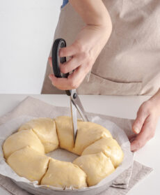Il giorno successivo praticate nella ciambella 8 tagli equidistanti con le forbici. Spennellate la superficie con il tuorlo sbattuto con il latte e cuocete in forno caldo a 180-190 ° per circa 50 minuti, finché sarà ben dorata.