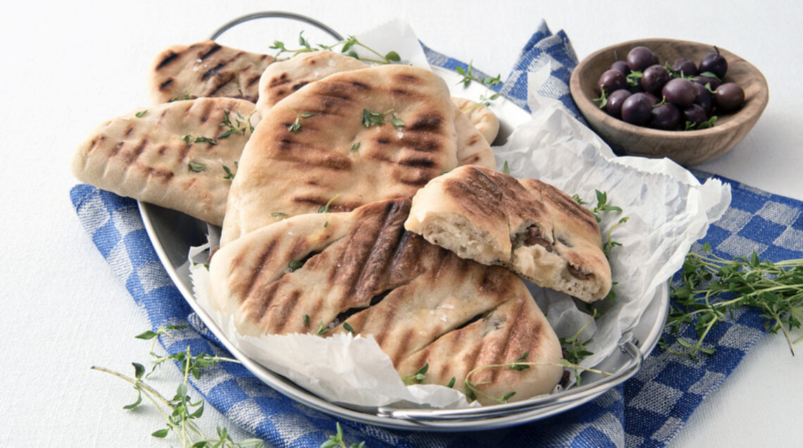 3 Scaldate bene una piastra, abbassate la fiamma e cuocetevi le focacce 4 minuti per lato. Spennellatele con un filo d'olio e cospargetele con origano fresco.