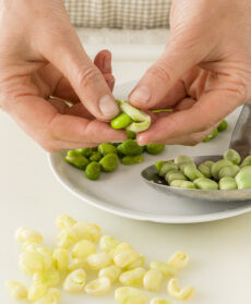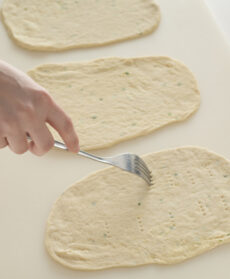 Bucherellate le focacce con i rebbi della forchetta e fatele riposare per almeno 30 minuti. Intanto, tuffate le fave in una pentola con acqua bollente e cuocetele per 2-3 minuti. Sgocciolate le fave in una ciotola con acqua e ghiaccio, tenendo da parte poca acqua di cottura.