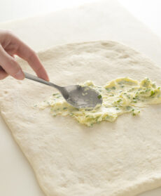Trasferite il burro morbido in una ciotolina e aggiungete un pizzico di sale e pepe, la scorza del limone grattugiata e l'erba cipollina tagliuzzata con le forbici; amalgamate bene gli ingredienti con una forchetta. Stendete la pasta da pane sulla spianatoia infarinata con il matterello, in modo da ottenere un rettangolo dello spessore di circa 1/2 cm; spalmate il burro aromatico al centro con un cucchiaio.