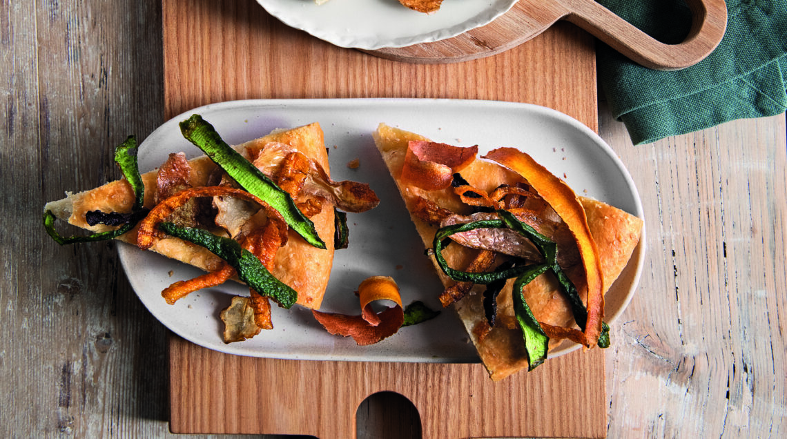 Si potrebbe pensare a una ricetta antispreco, ma le bucce fritte sono in realtà uno sfizio goloso e ricercato. Vanno bene quelle di carote, patate, topinambur, zucchine e anche melanzane purché tagliate a striscioline sottili altrimenti sono troppo amare. Noi le abbiamo accompagnate alla focaccia, ma sono perfette come antipasto, per accompagnare un'aperitivo o una zuppa o come snack. Particolarmente buone calde, quando sono ancora croccanti, non deludono neppure fredde quando cedono alla morbidezza. Potete accompagnarle con salse varie, maionese, senape, ketchup, tzatziki, hummus o babaganush (crema di melanzane).