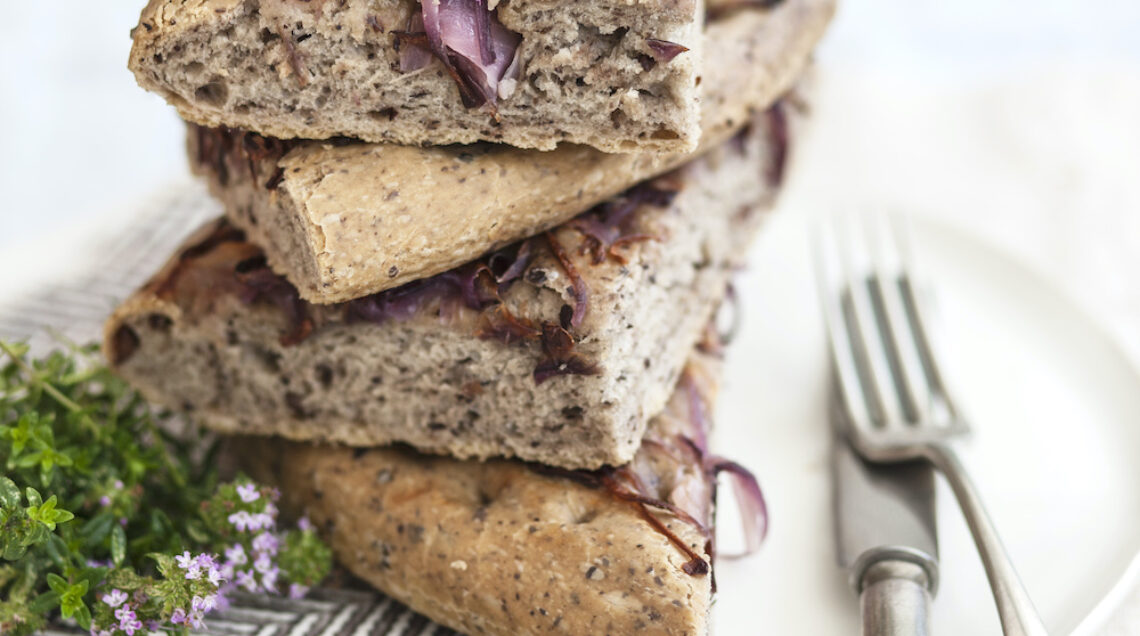 3) Mettete la focaccia in forno e cuocetela a 200° per circa 40 minuti. Toglietela dal forno, distribuite sulla superficie le olive e il timo, rimettetela in forno per altri 10 minuti e servitela.