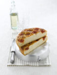 2) Farcisci la focaccia. Riprendi l’impasto, dividilo in due panetti, uno un po’ più grande dell’altro; stendili con il mattarello sulla spianatoia infarinata, ricavando 2 dischi sottili, uno leggermente più grande dell’altro. Con quello più grande ricopri il fondo e i bordi interni di uno stampo da crostata di 24 cm di diametro unto con una noce di burro. Metti sul fondo il gorgonzola a pezzi e privato della crosta e il grana grattugiato; copri con il disco più piccolo di pasta, ripiega la pasta del disco più grande su quello più piccolo e pressa con le dita per sigillare la pasta.