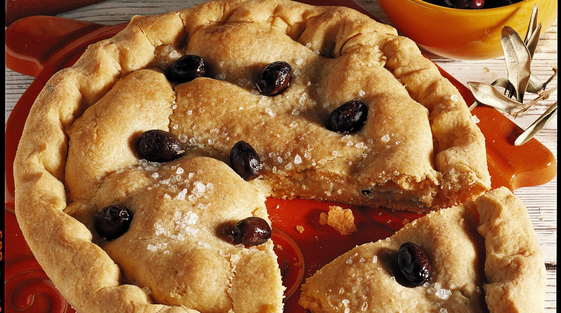 3) Completa e cuoci la focaccia ai formaggi. Cospargi la superficie della focaccia con un pizzico di sale grosso e distribuisci le olive nere, come più ti piace. Cuoci la focaccia ai formaggi in forno caldo a 180° per circa 45 minuti, finché la superficie sarà dorata. Sforna la focaccia ai formaggi, estraila dallo stampo e servila calda.