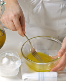 Versa 4 cucchiai di olio in una ciotola, come prevede la ricetta della focaccia genovese unisci 4 cucchiai di acqua e 1 raso di sale grosso e sbatti con una forchetta fino ad ottenere un'emulsione il più possibile omogenea, tieni conto che i granelli di sale grosso, a freddo, si sciolgono soltanto in minima parte.