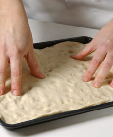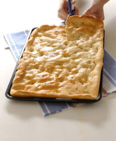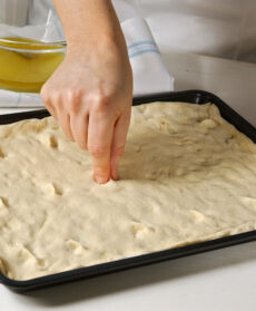 Pizzica la superficie della pasta con le dita, forma tante fossette regolari; quindi spennella uniformemente con metà della miscela di olio, sale e acqua; coprila e lasciala lievitare ancora per 20 minuti, in un luogo tiepido e riparato dall'aria.