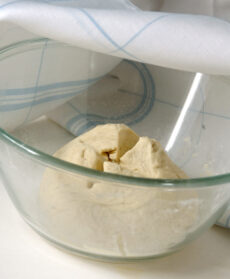 Impasta il panetto con il mix di farine rimasto, 1,5 dl di acqua, 2 cucchiai di olio e 1 cucchiaino di sale fino. Forma una palla, incidila a croce, copri con un telo e lascia lievitare per 30 minuti; lavora ancora qualche minuto, fai di nuovo una palla e lascia lievitare per altri 15 minuti.