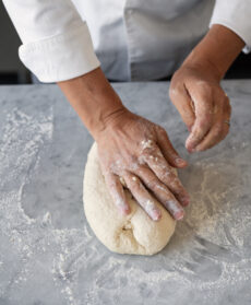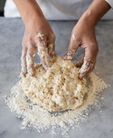 Impastate gli ingredienti e amalgamateli, trasferite il composto sul piano di lavoro leggermente infarinato e continuate a impastare versando 150 g di acqua poca alla volta (per circa 5-10 minuti).