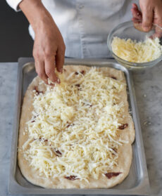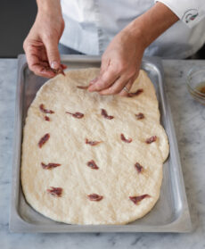 Riprendete l'impasto, prelevatene 1,3 kg e stendetelo in una teglia di 60x40 cm unta con l'olio rimasto. Distribuitevi sopra le acciughe ridotte a tocchetti.