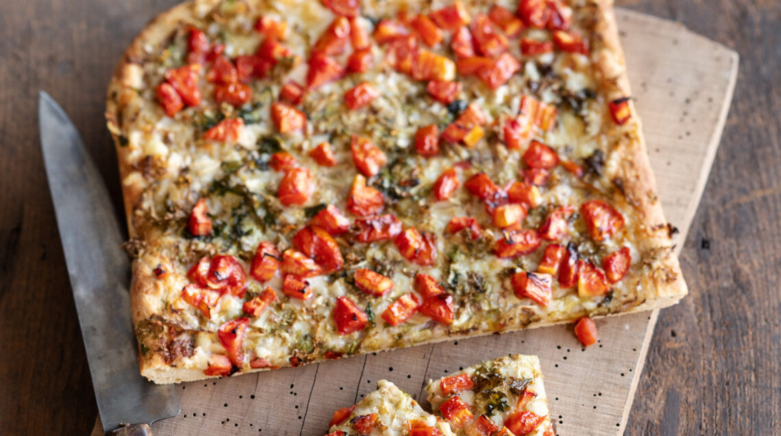 Una gustosissima focaccia con scarola e pomodoro, rinforzata dal gusto sapido e verace delle acciughe e della toma di capra. Squisita calda o fredda, soddisfa il pranzo e rallegra uno spuntino
