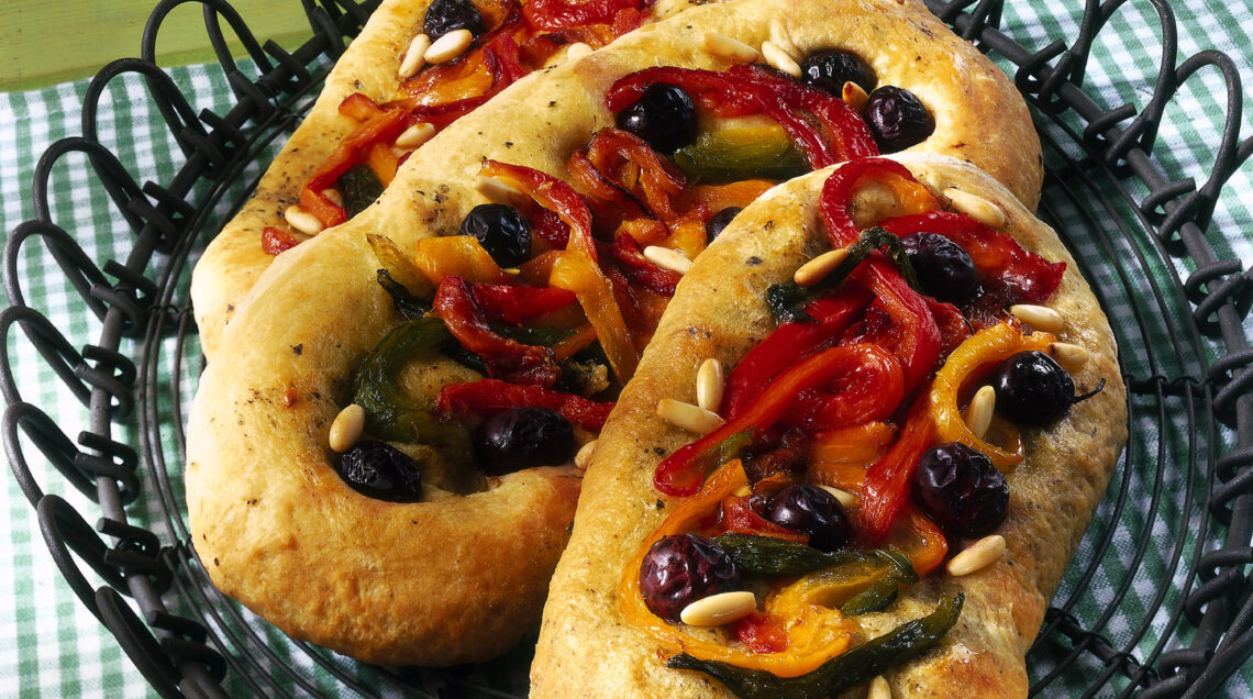3) Completa e cuoci. Disponi le focacce su una larga teglia unta con un filo di olio extravergine di oliva e distribuisci su ciascuna i peperoni, i pinoli e le olive nere; regola di sale e di pepe. Inforna e cuoci le focacce alle olive con peperoni e pinoli per 15 minuti circa. Sforna e servi le focacce calde.
