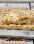 4 Trasferite la pasta in una teglia di 30x40 cm abbondantemente unta con olio e allargatela bene con i polpastrelli. Copritela con pellicola e lasciatela lievitare a temperatura ambiente per altre 2 ore.