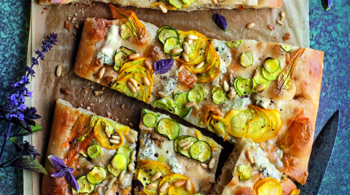 6 Lavate le zucchine e tagliatele a fettine rotonde molto sottili con una mandolina. Distribuitele sulla focaccia insieme ai pinoli e a metà del gorgonzola a fiocchetti e cuocete per altri 10 minuti. Poi aggiungete il gorgonzola rimasto e lasciate in forno ancora per 1 minuto. Completate con foglioline di basilico e pepe. Servite la focaccia tiepida o fredda.