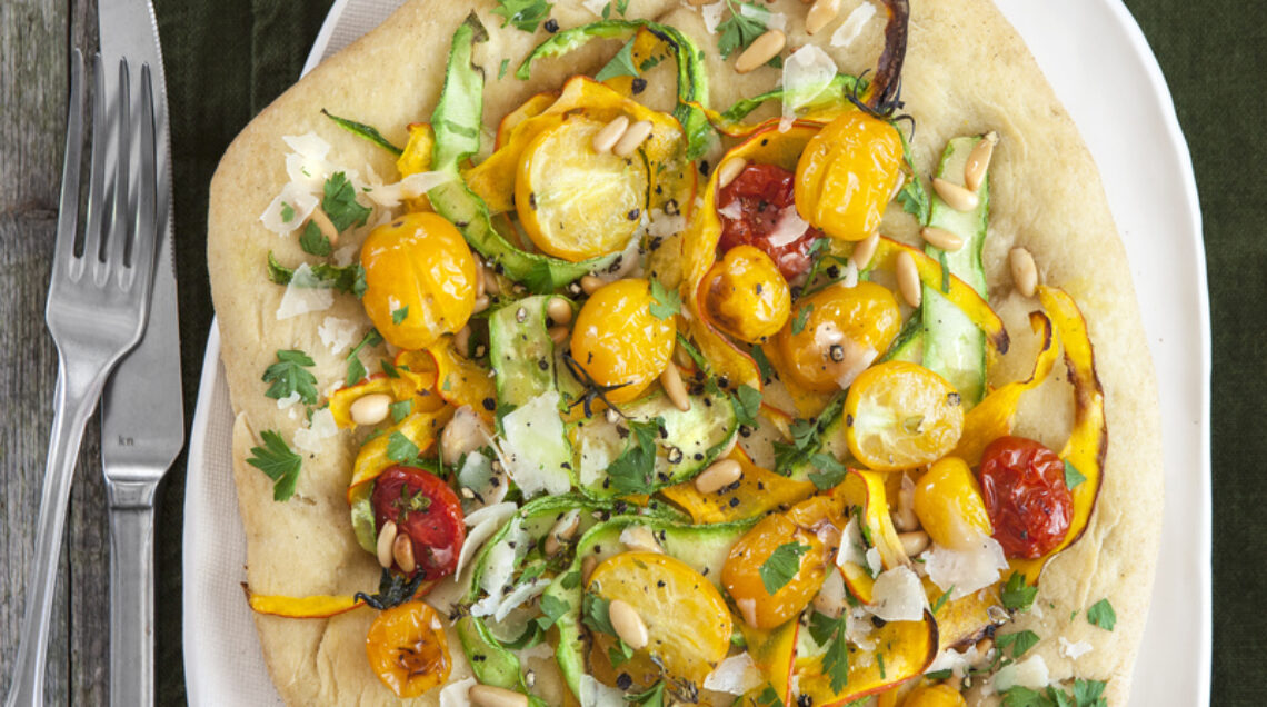Con l'arrivo della stagione autunnale lasciatevi ispirare dalla focaccia croccante con zucca, zucchine, pomodorini e pinoli. L'impasto fatto in casa è farcito con verdure e scaglie di pecorino