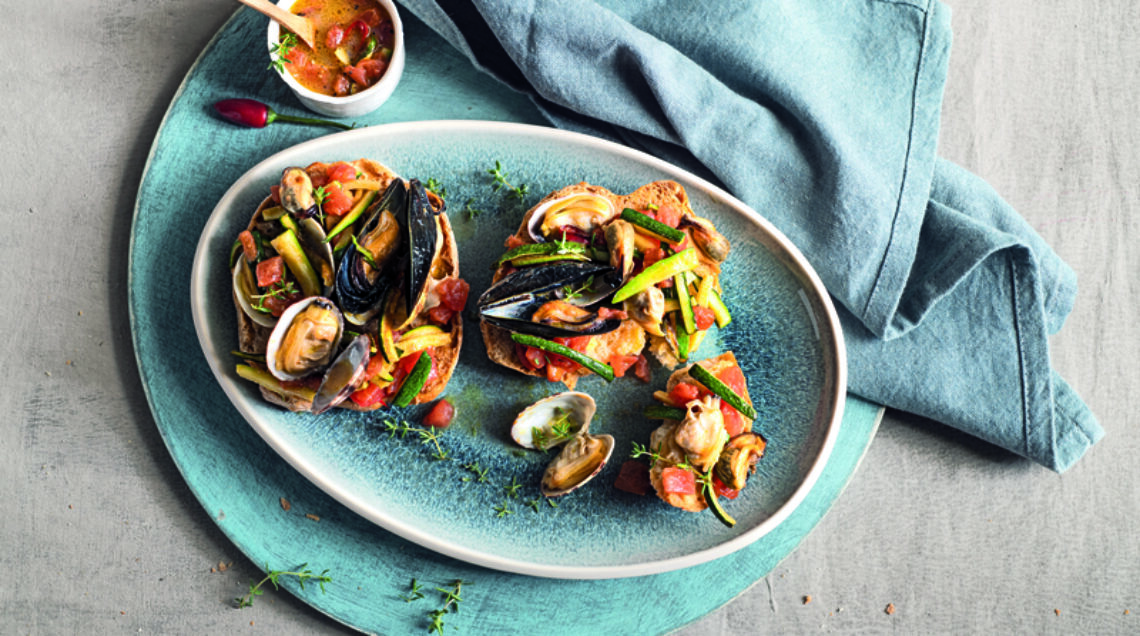 Mondate le zucchine e tagliatele a bastoncini. Lavate i pomodori, incideteli a croce, tuffateli in acqua in ebollizione per 40-50 secondi, scolateli e immergeteli in acqua fredda; scolateli, privateli della pelle, dei semi e tagliateli a cubetti di 1 cm. Sbucciate e affettate uno spicchio d'aglio; affettate anche il peperoncino. Scaldate un filo d'olio e l'aglio rimasto in una larga padella, unite le cozze e le vongole, coprite la padella e fate aprire le conchiglie a fiamma vivace. Quando tutti i gusci saranno aperti, togliete la pentola dal fuoco e filtrate il fondo di cottura. Sgusciate le cozze e le vongole eliminando quelle rimaste chiuse e lasciatene alcune nel guscio per il decoro.