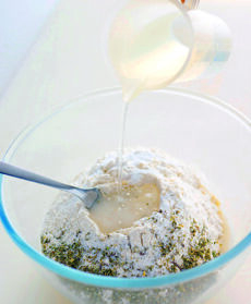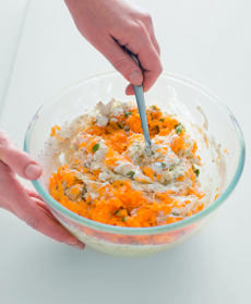 Preparate l'impasto: raschiate le carote, eliminate le estremità, poi lavatele, asciugatele e grattugiatele usando la grattugia a fori medi. Riunite i due tipi di farina in una ciotola capiente, aggiungete il bicarbonato, un cucchiaino di sale, un po' di origano sbriciolato e 2 dl d'acqua e impastate bene tutti gli ingredienti.