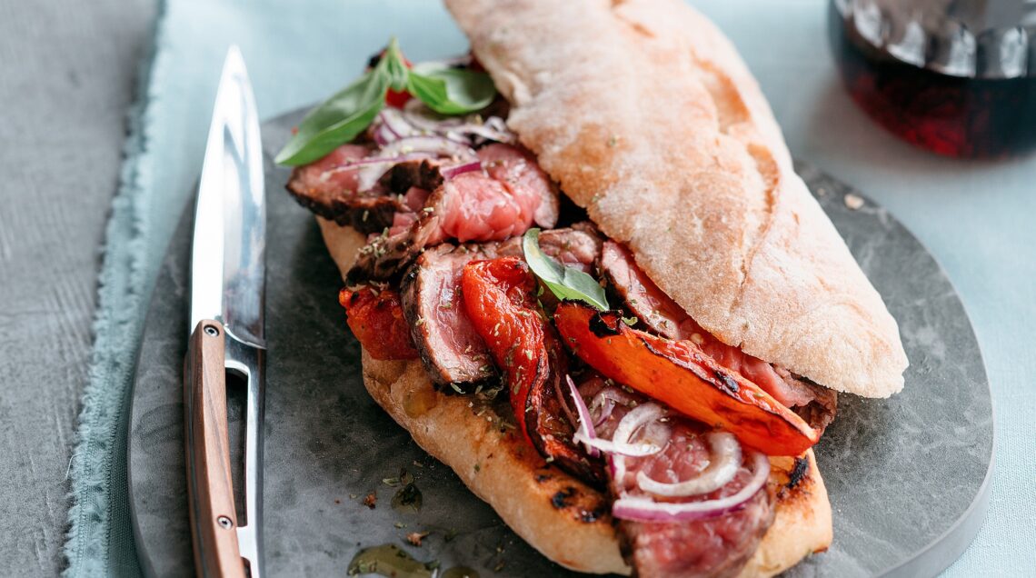 Un panino gourmad, farcito con fettine di manzo, cipolle e verdure arrostite. Anche per una serata con amici speciali