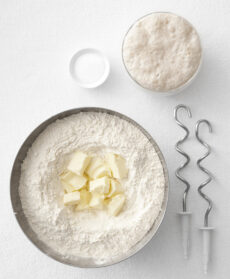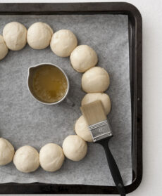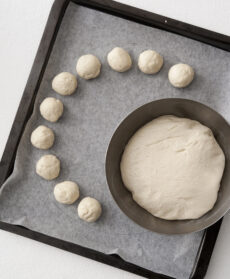 Mentre l’impasto della corona di panini lievita, disegna su di un foglio di carta da forno un grosso cerchio. Una volta che il pane sarà raddoppiato di volume, dividilo in palline omogenee di 30 o 40 grammi e mettile nel cerchio che hai tracciato, lasciando tra l’una e l’altra uno spazio di circa 1 centimetro. Rimetti la corona a lievitare fino a che l’impasto cresciuto non unisce tutti i blocchi.