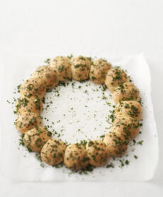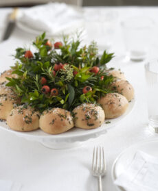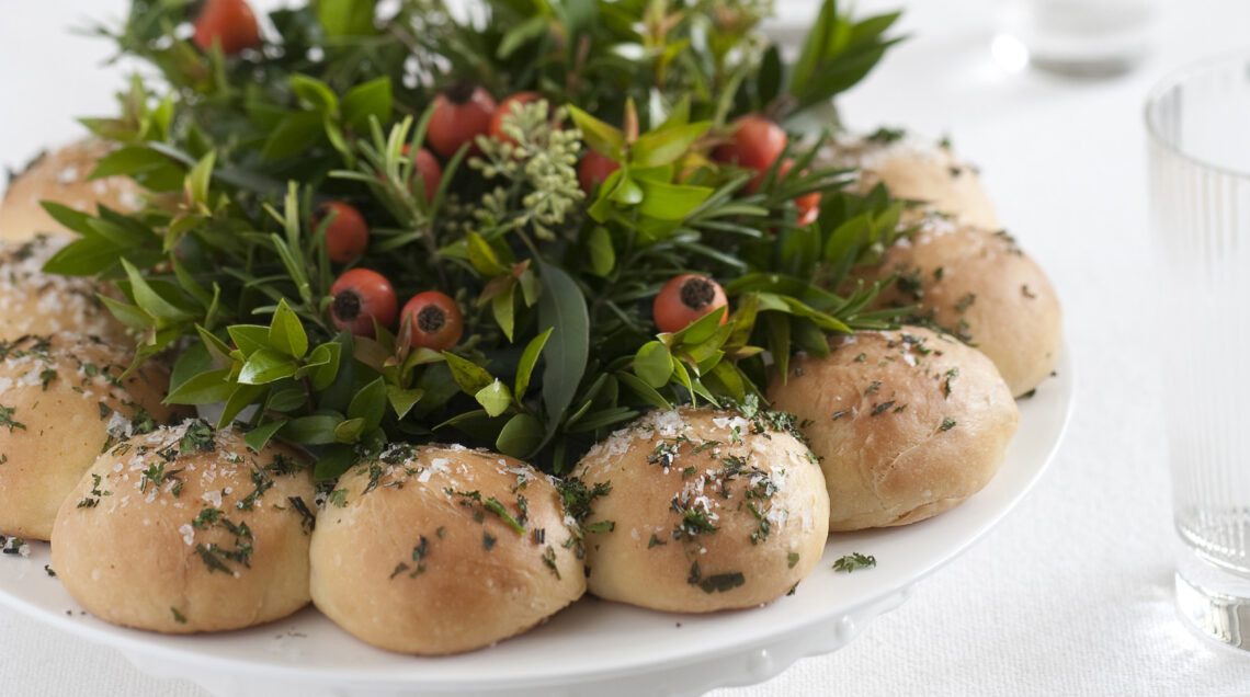 La corona di panini alle erbe può essere un perfetto centro tavola: disponila su di un’alzatina e metti una piccola composizione di proprio nel centro.