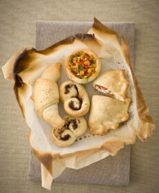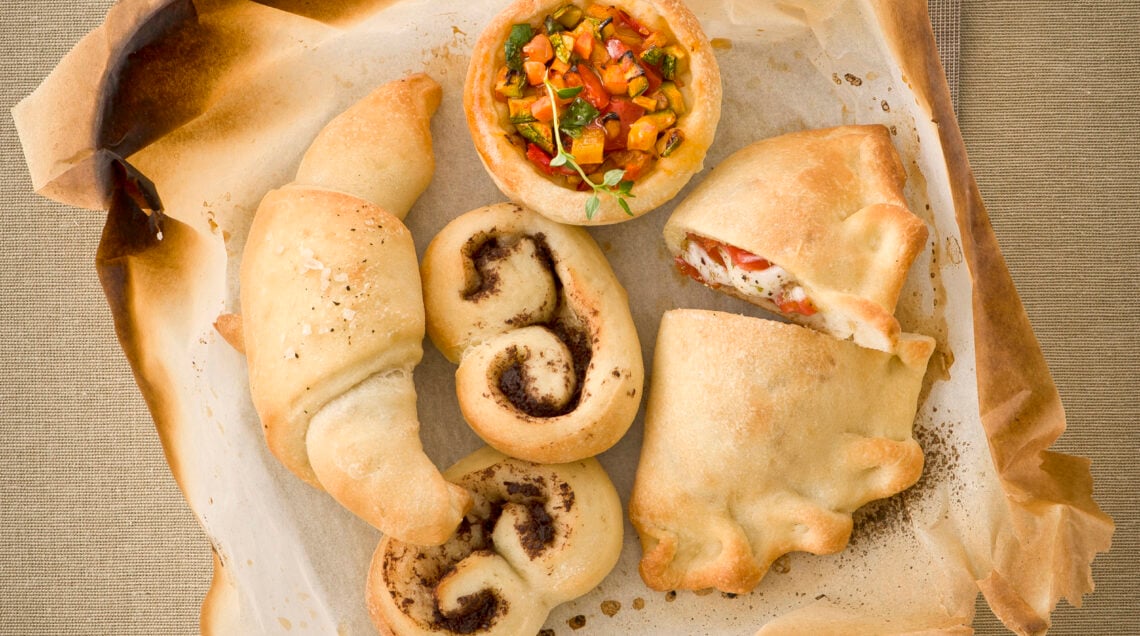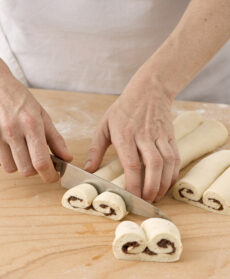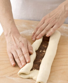 Inizia a preparare la ricetta delle doppie girole stendendo 500 g di pasta per pizza fino a ottenere un rettangolo dello spessore di 3-4 cm. Ritaglia delle strisce di pasta della larghezza di circa 15 cm e tienile da parte.