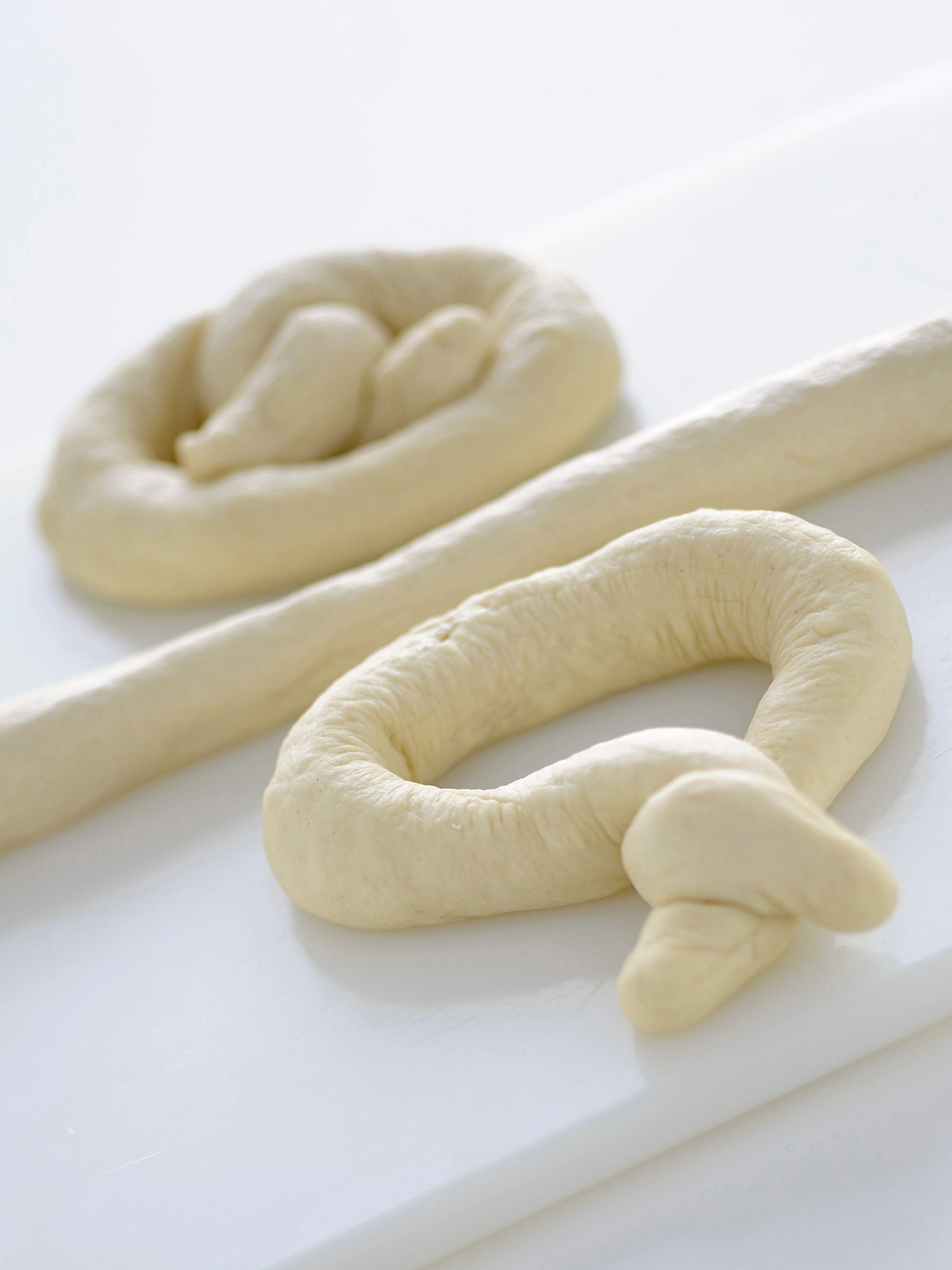2) Sgonfia l'impasto a mano e dividilo in panetti (puoi farne 8 o 10) e forma dei cordoncini di 40 cm che saranno affinati alle punte. Le estremità dell'impasto dovranno essere intrecciate lasciando 2 code di 4 cm che a loro volta dovrai ripiegare all'interno per formare un vero e proprio nodo e schiaccia con le mani per far aderire la pasta.