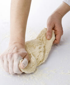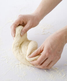 Tirate quindi il composto a più riprese finché comincerà a lacerarsi. Durante la sbattitura e la torcitura e per stimolare il glutine e ottenere una cottura uniforme, sollevate e sbattete la pasta ogni tanto fino a farla diventare liscia e compatta.
