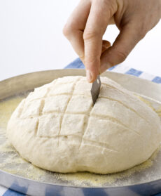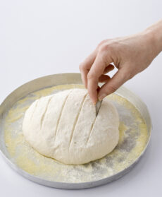 Dopo che l'impasto sarà lievitato spolverizzate la pagnotta di farina e incidete il dorso con una lametta formando delle linee perpendicolari fra loro.