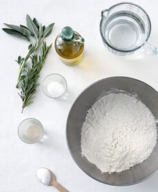 Versate 400 ml di acqua tiepida in una ciotola, unite il lievito e lo zucchero, mescolate con una frusta e fate riposare per 4-5 minuti. Nel frattempo, lavate salvia e rosmarino, asciugateli e tritateli. Versate nella ciotola la farina, le erbe tritate, l'olio e il sale e mescolate energicamente con una frusta o un cucchiaio di legno finché otterrete un impasto omogeneo. Coprite la ciotola con pellicola e lasciate lievitare l'impasto in un luogo tiepido per 1 ora (per esempio nel forno spento con la luce acesa).
