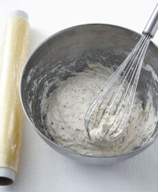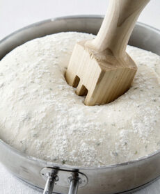 Spolverizzate con 1 cucchiaio di farina il fondo una pentola in acciaio di 25 cm di diametro e 6-7 cm di altezza, coprite con un disco di carta da forno e spolverizzate con un altro cucchiaio di farina. Ricoprite un piatto piano con circa 40 g di farina, rovesciatevi sopra l'impasto e rigiratelo più volte in modo che risulti uniformemente infarinato. Mettetetelo nella pentola preparata, coprite con un coperchio e lasciate lievitare ancora per 30-40 minuti.