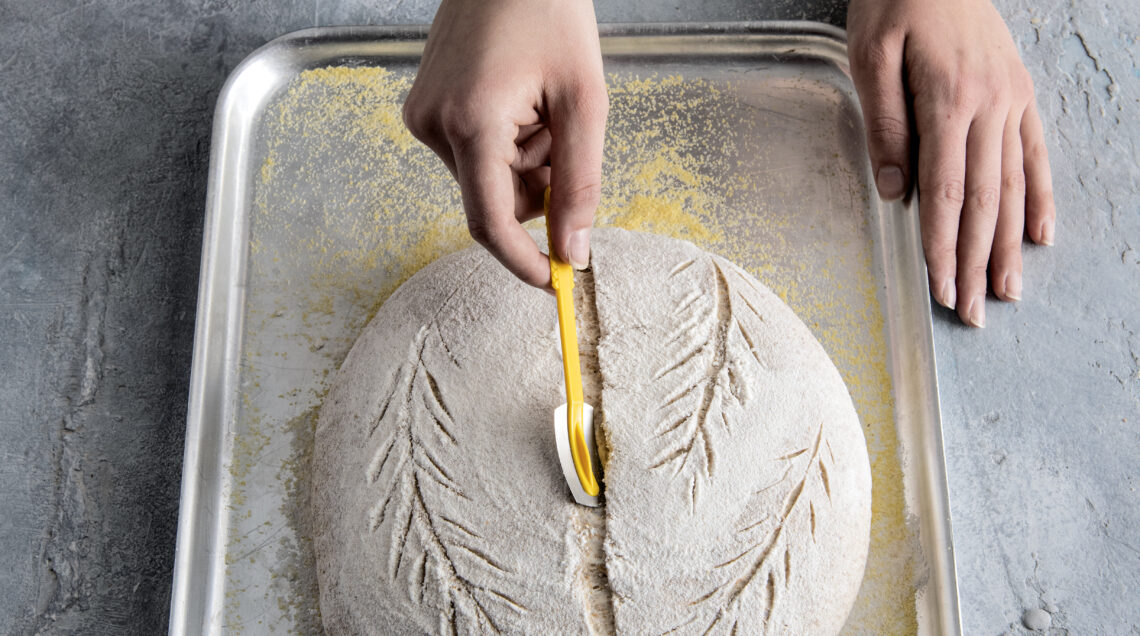 9) Togliete l'impasto dal frigorifero, spolverizzatelo con la farina di mail e trasferitelo su un foglio di carta da forno in modo che la paste liscia sia rivolta verso l'altro. Con una lametta affilata incidetelo a piacere (tenere presente che durante la cottura si distenderà maggiormente lungo la direzione delle incisioni) e trasferitelo subito sopra la piastra di refratterio (o sulla teglia).