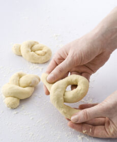 Prendi un altro panetto di pasta lievitata, dividilo in pezzi, arrotolali sulla spianatoia infarinata fino ad avere dei bastoncini lunghi 25-30 centimetri. Fai dei nodi come se fossero nastri, senza stringere troppo, mettili su di un’altra placca imburrata e infarinata.