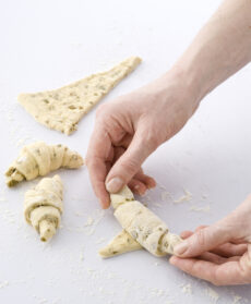 Prendi l’ultimo panetto di pasta, aggiungi una manciata di olive tritate, stendila fino allo spessore di circa 1 centimetro, poi ritaglia tanti triangoli isosceli e arrotolali dalla base, arcuandoli leggermente.
