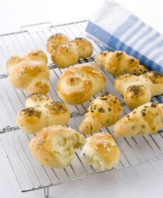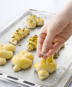 Sistemali sulla placca infarinata e imburrata, coprili con un canovaccio umido e rimettili a lievitare nel forno spento ma con la luce accesa. Spennella tutti i panini con un tuorlo sbattuto e cospargi i trifogli con semi di papavero e i nodi con grani di sale.