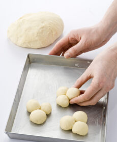 Terminato il tempo della lievitazione, dividi la pasta in 3 parti. Da uno dei panetti ricava tante sfere delle dimensione di una piccola prugna. Sistemale su una placca imburrata, vicine a 3 a 3 e falle aderire.