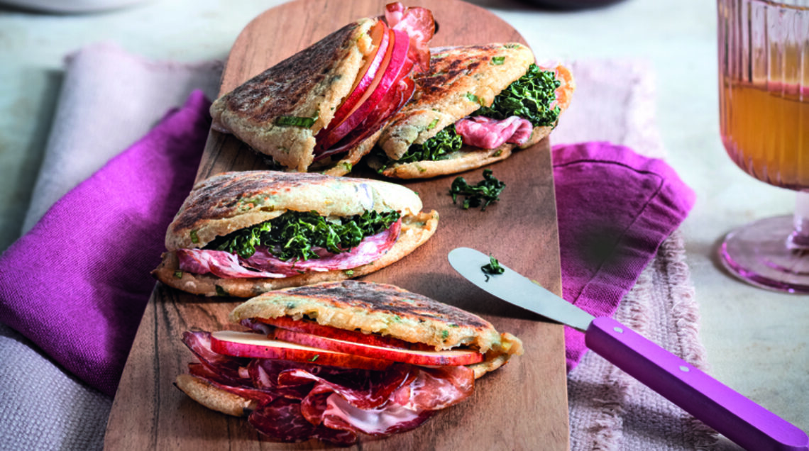 La ricetta perfetta per un panino diverso dal solito, a base di patate e con farciture particolare: coppa e pere e finocchiona e insalatina di cavolo nero
