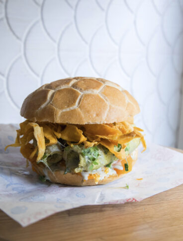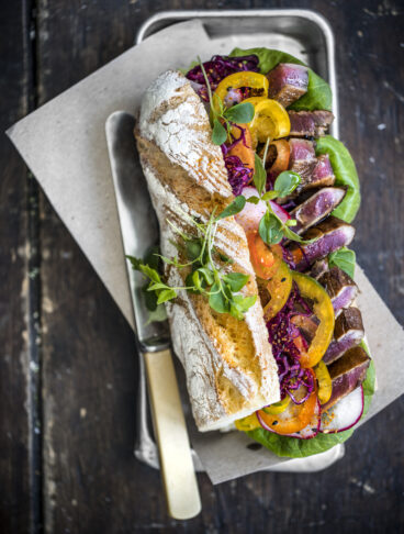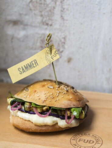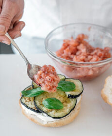 Tagliate la mozzarella a fette e appoggiatene 4 sulla base del panino, aggiungete qualche rondella di melanzana e condite con un giro d'olio e foglie di basilico. Proseguite con la tartare, l'insalata di pomodori e il sedano ghiacciato. Chiudete il panino e servite.